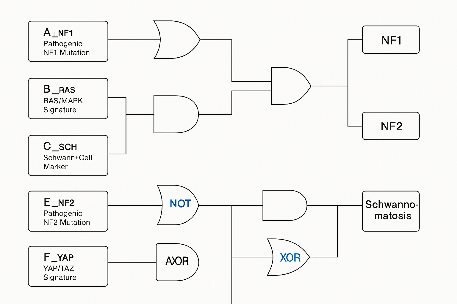 NF1-POS = A_NF1 OR ( B_RAS AND NOT E_NF2 AND NOT (G_SMARCB1 OR H_LZTR1) )