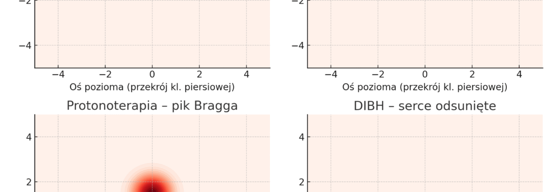 | Protonoterapia | wykorzystanie piku Bragga – maksymalna dawka w guzie, minimalna poza nim | najlepsza ochrona serca i płuc, szczególnie u dzieci i młodych dorosłych | bardzo wysokie koszty, ograniczona dostępność ośrodków | redukcja dawki dla serca >70% w porównaniu do fotonów |